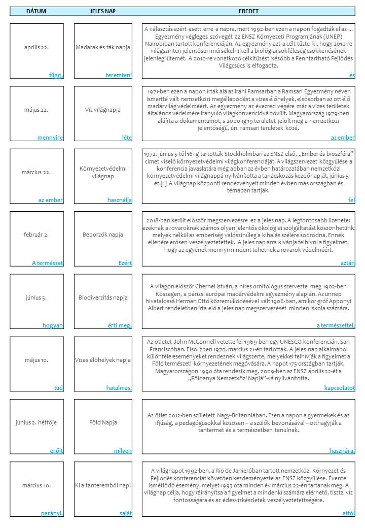 A feladatotok a következő: tegyétek sorrendbe az évben egymás után következő jeles dátumokat, és illesszétek mellé a jeles napot és annak eredetét. Ha jól dolgoztatok, megoldásként Szent-Györgyi Albert egyik gondolatát tudjátok összeolvasni a kék szavakból.